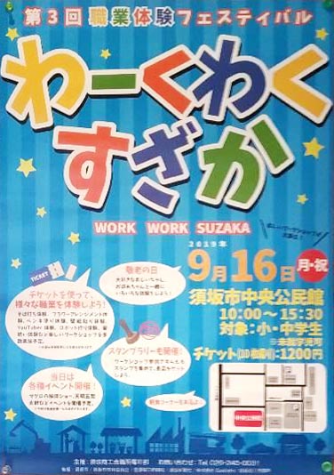 9月16日(月・敬老の日)に職業体験フェスティバル、わーくわくすざかに参加します。